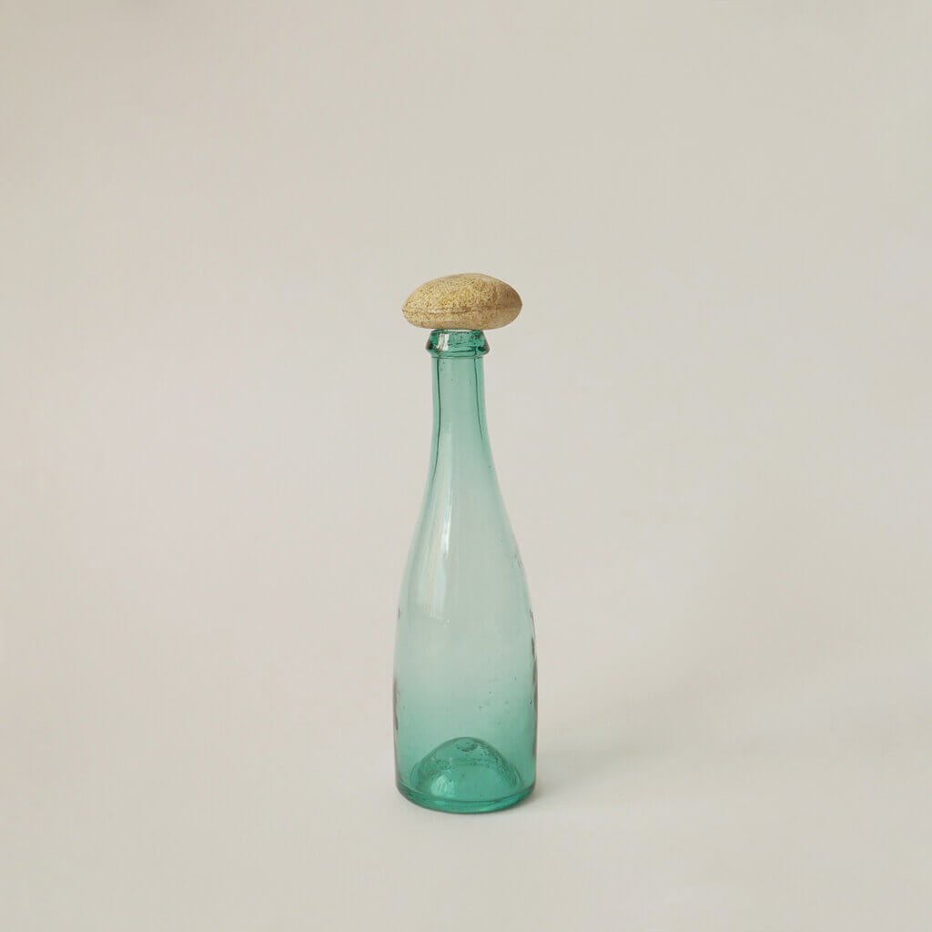 気泡やムラがたっぷりな瓶です。やや緑がかって、リサイクルガラスでしょうか。口が広めのボトルなので、花瓶にも使いやすい形。シンプルな形に豊かな質感が魅力的です。