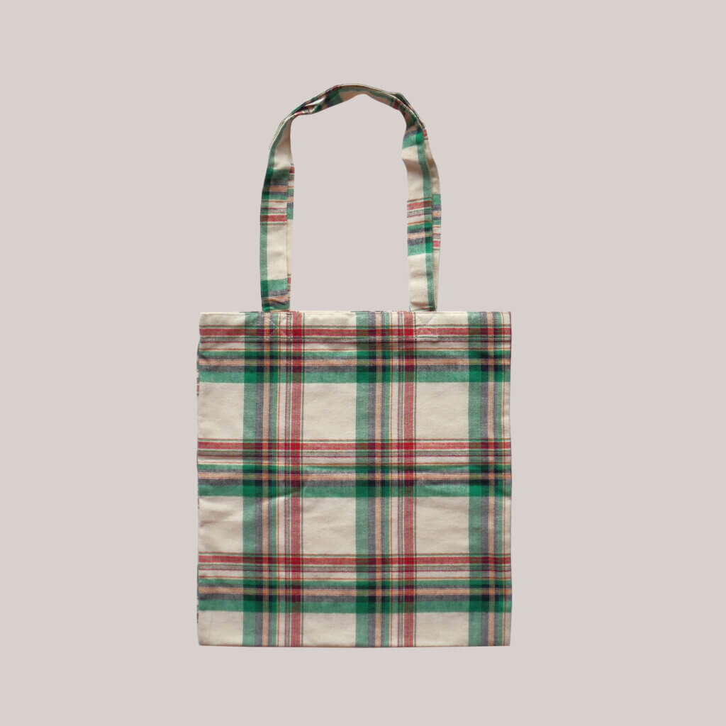 レッド、ネイビー、グリーンなどの色からなる、ヘリンボーン織りのチェック柄。